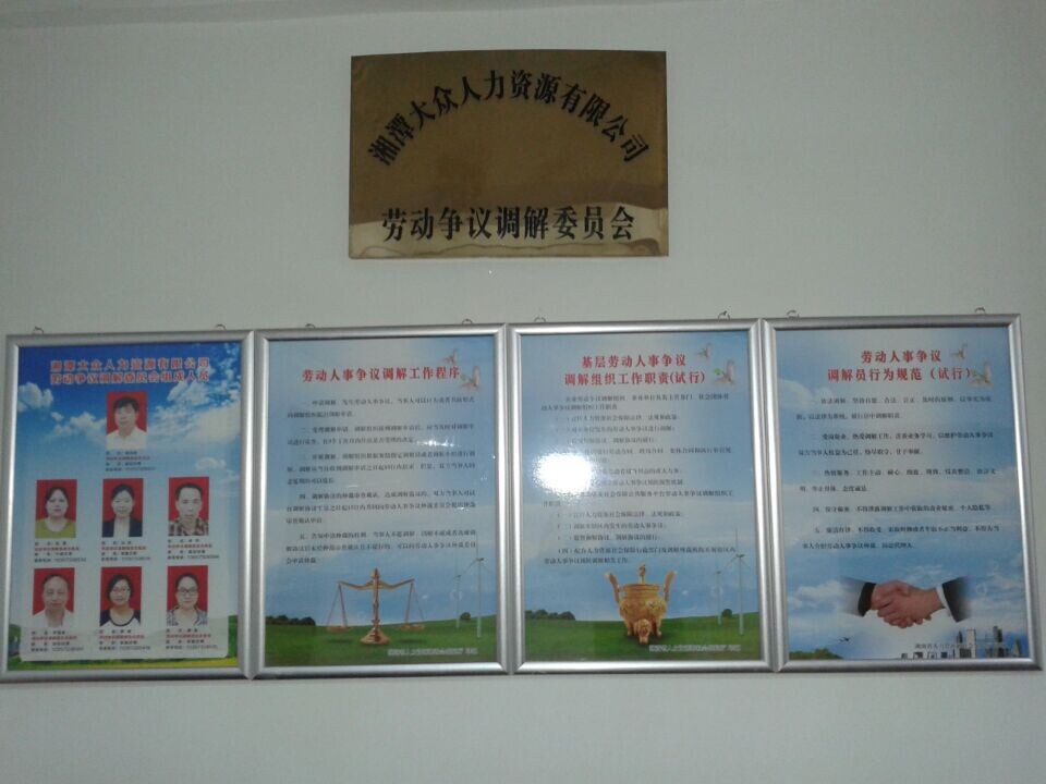 為了規(guī)范勞動人事爭議預(yù)防調(diào)解處理工作,維護社會和諧穩(wěn)定,按照潭人社發(fā)【2014】29號文件要求,根據(jù)《中華人民共和國勞動爭議調(diào)解仲裁法》等法律法規(guī)精神,湘潭大眾人力資源有限公司于2014年6月13日調(diào)整規(guī)范了勞動爭議調(diào)解委員會,并對委員會成員、工作程序、工作職責(zé)、行為規(guī)范進行了上墻公示。