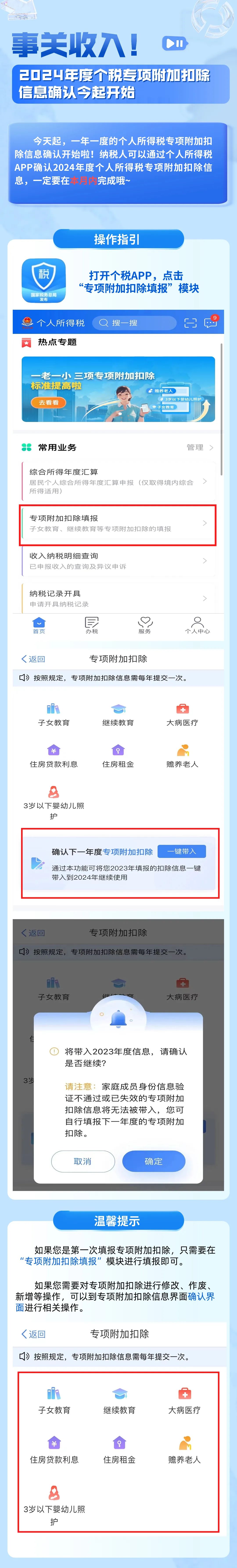 今天起,一年一度的個(gè)人所得稅專項(xiàng)附加扣除信息確認(rèn)開始啦!納稅人可以通過(guò)個(gè)人所得稅APP確認(rèn)2024年度個(gè)人所得稅專項(xiàng)附加扣除信息,一定要在本月內(nèi)完成哦~